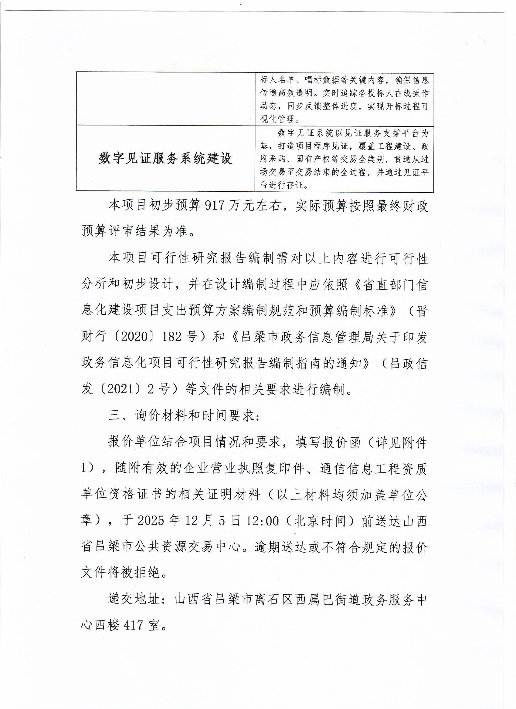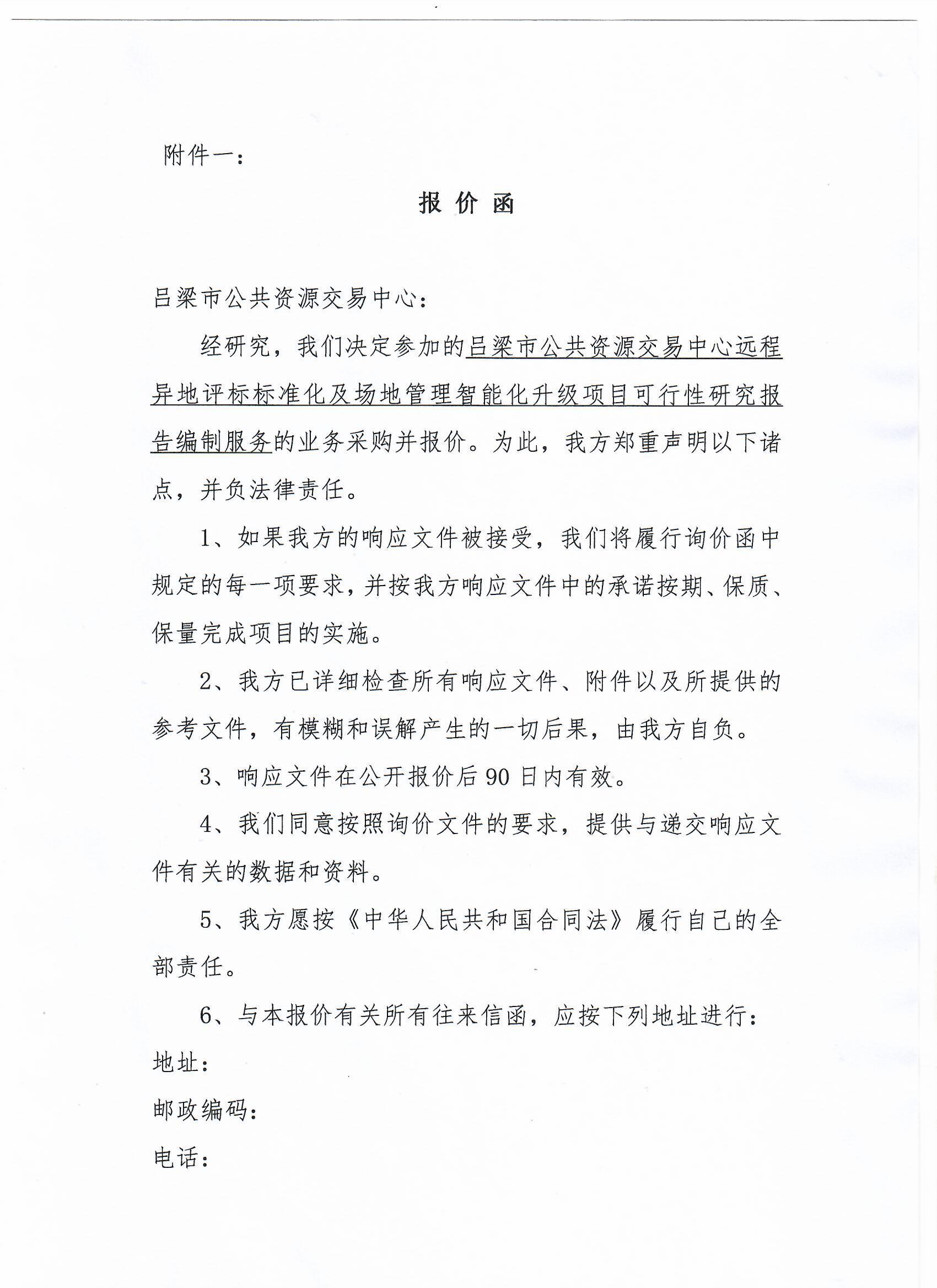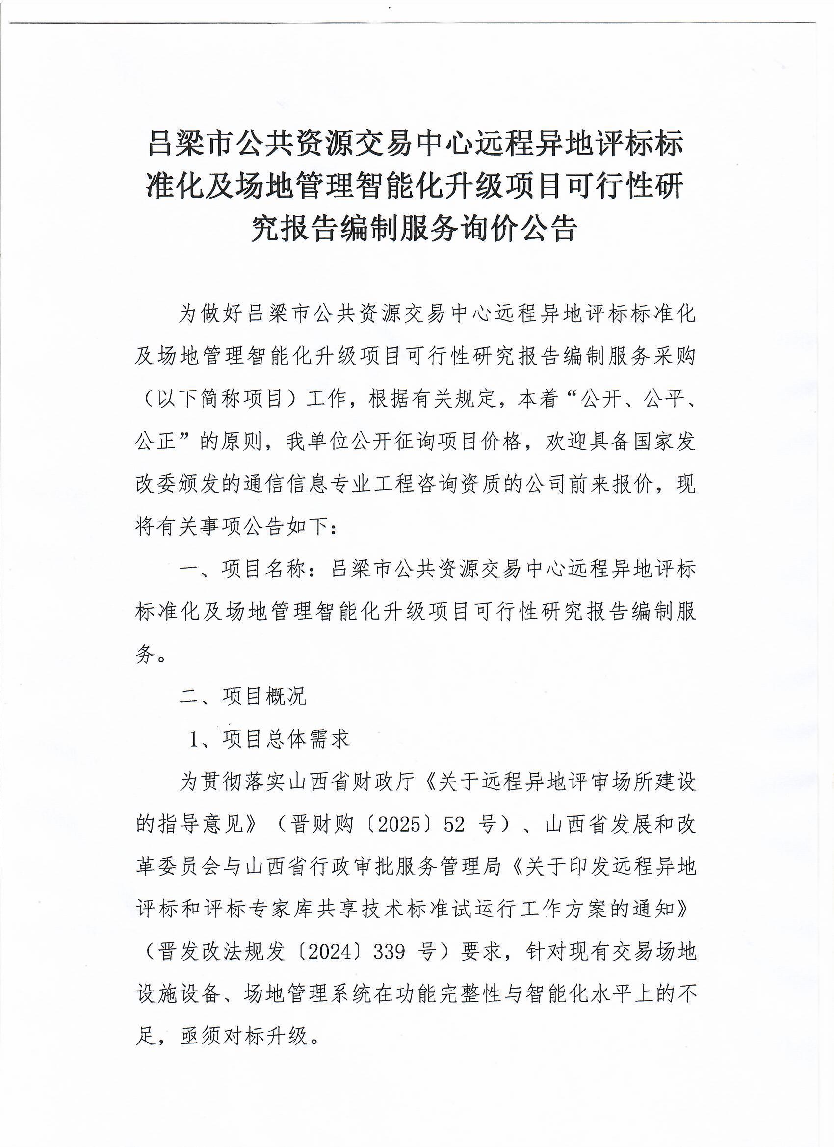 吕梁市公共资源交易中心远程异地评标标准化及场地管理智能化升级项目可行性研究报告编制服务询价公告
